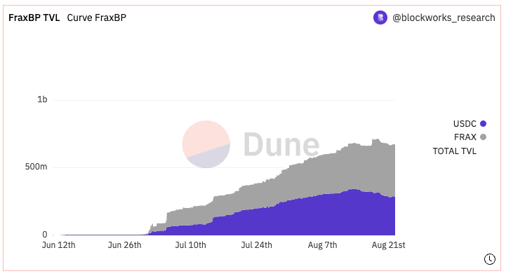 The Frax Base[d]pool is en route to amass its first billion in perhaps just a couple months, a particularly impressive metric in the bear market. From the great new Blockworks Research Dune dashboard: