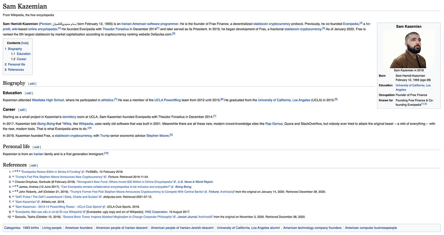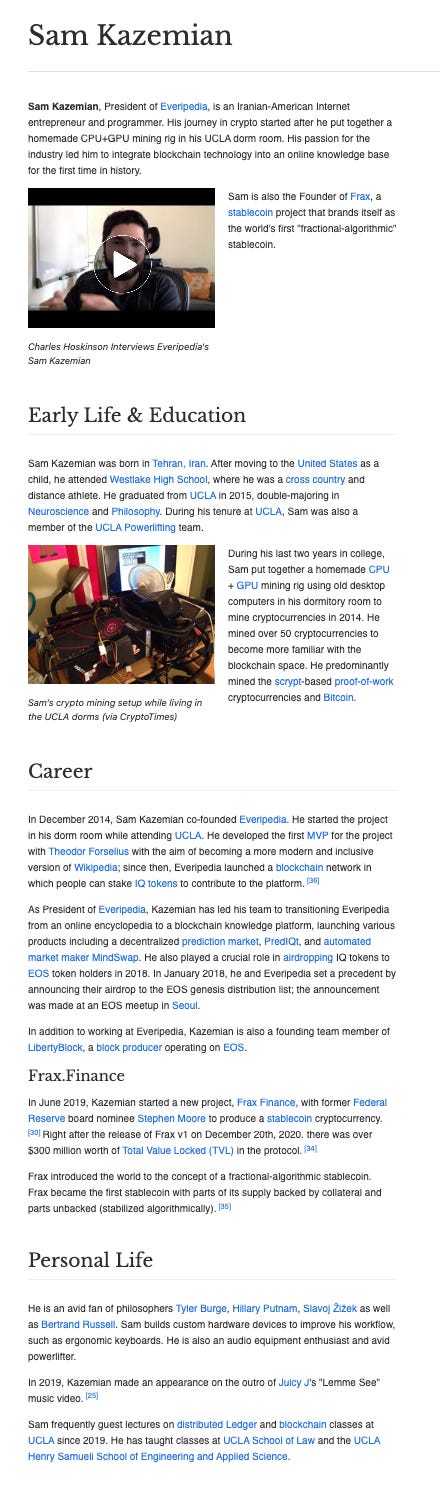 Ever wonder how big Sam’s brain is? Before launching Frax Finance he’d co-founded a competitor to Wikipedia. Half a decade later, the rest of the world has caught up, and concerns about Wikipedia has become commonplace.