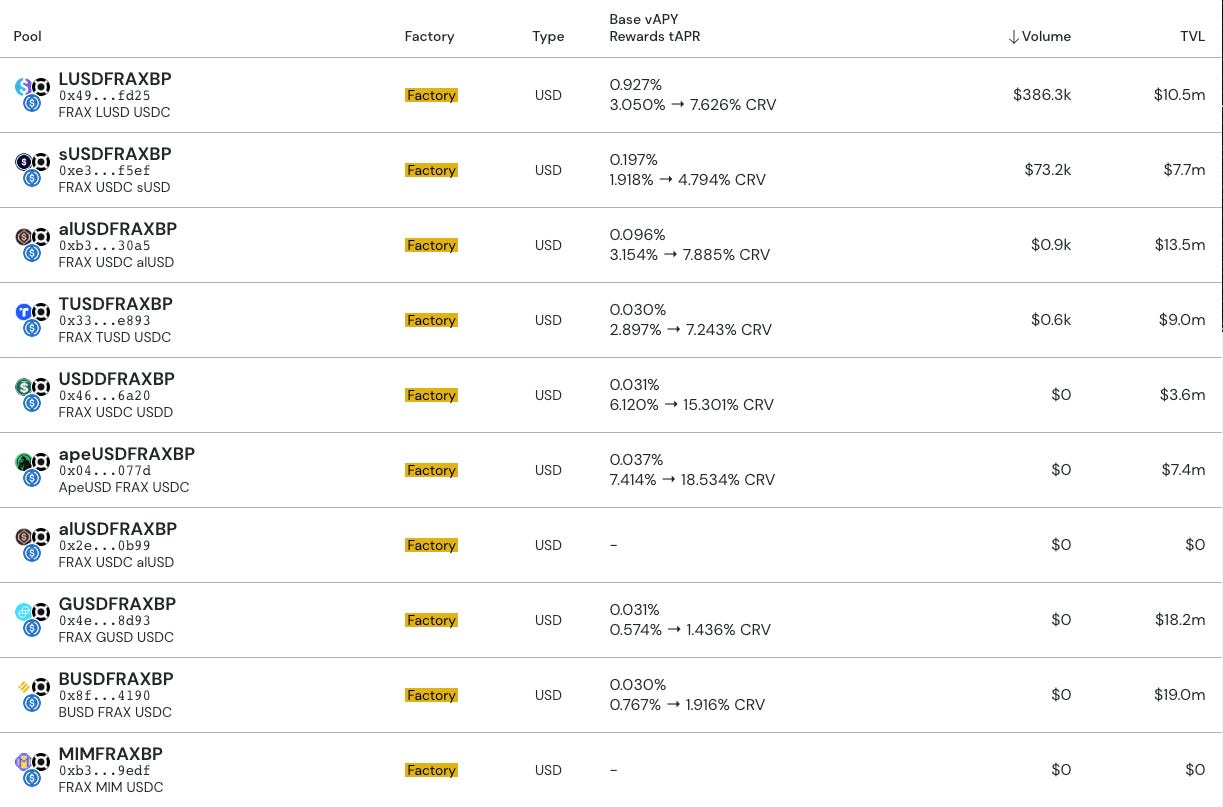 Regardless of any hypothetical $USDC risk, the thought of Frax kicking in its treasury towards rewards for pools launched against the FRAX BP is delicious enough to spur tons of activity on Curve. We observe eight funded pools already built against the new base pair:
