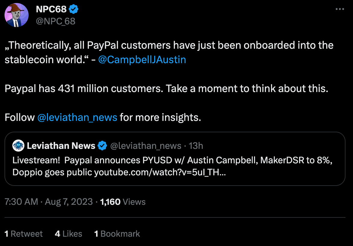PayPal rocked the news cycle with their announcement of $pyUSD, a new stablecoin. It’s rightly considered a watershed moment for crypto, as aptly explained by Austin Campbell on yesterday’s Leviathan livestream.