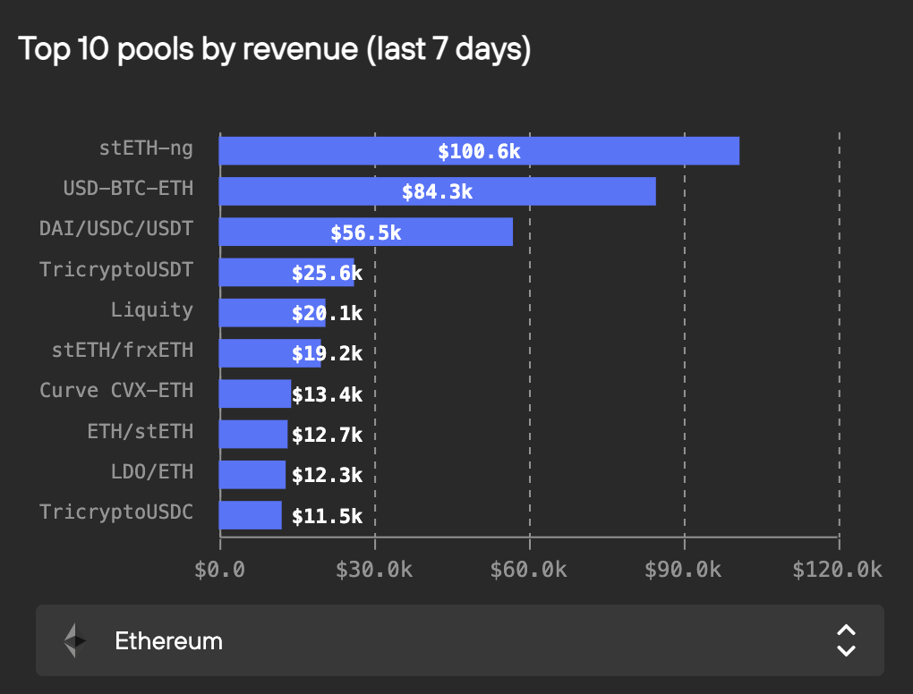 Many don’t realize that Curve v2 pools are in fact good drivers of revenue for veCRV holders. TriCrypto ranks second to the stETH pool in terms of revenues, despite being a fairly small pool.