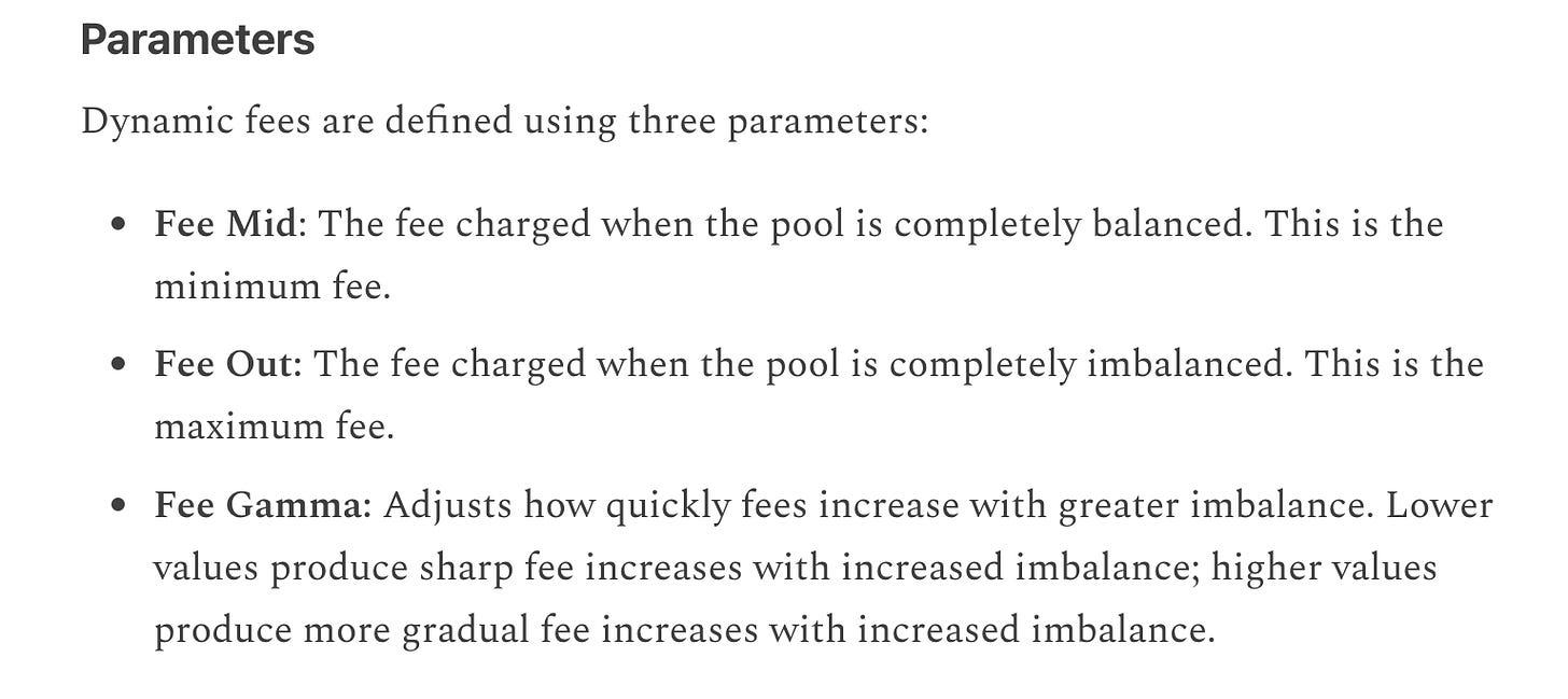 When prices shift rapidly, everybody wants to trade the pool. It’s imbalanced, and there’s free money on the table for whoever trades it back into balance. Thus, in times of high volatility, you can charge a higher fee (the parameter “fee out”). You can think of it as a tax on arbitrageurs. Take a piece of their pie, but they may think it immaterial, because they’re still eating a free lunch.