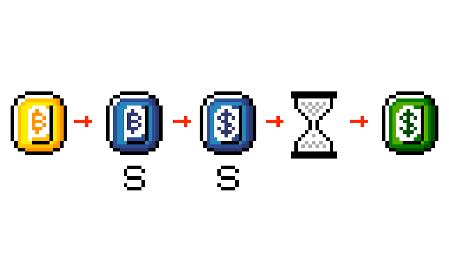 A few things to note in this chain. Synthetix has a mandatory waiting period of about six minutes to prevent against sudden price fluctuations. When the sBTC is converted to sUSD in this example, it is locked up for a short waiting period before it can be converted into the final output. This means it is impossible to perform the exchange atomically, and you have to wait a few blocks.