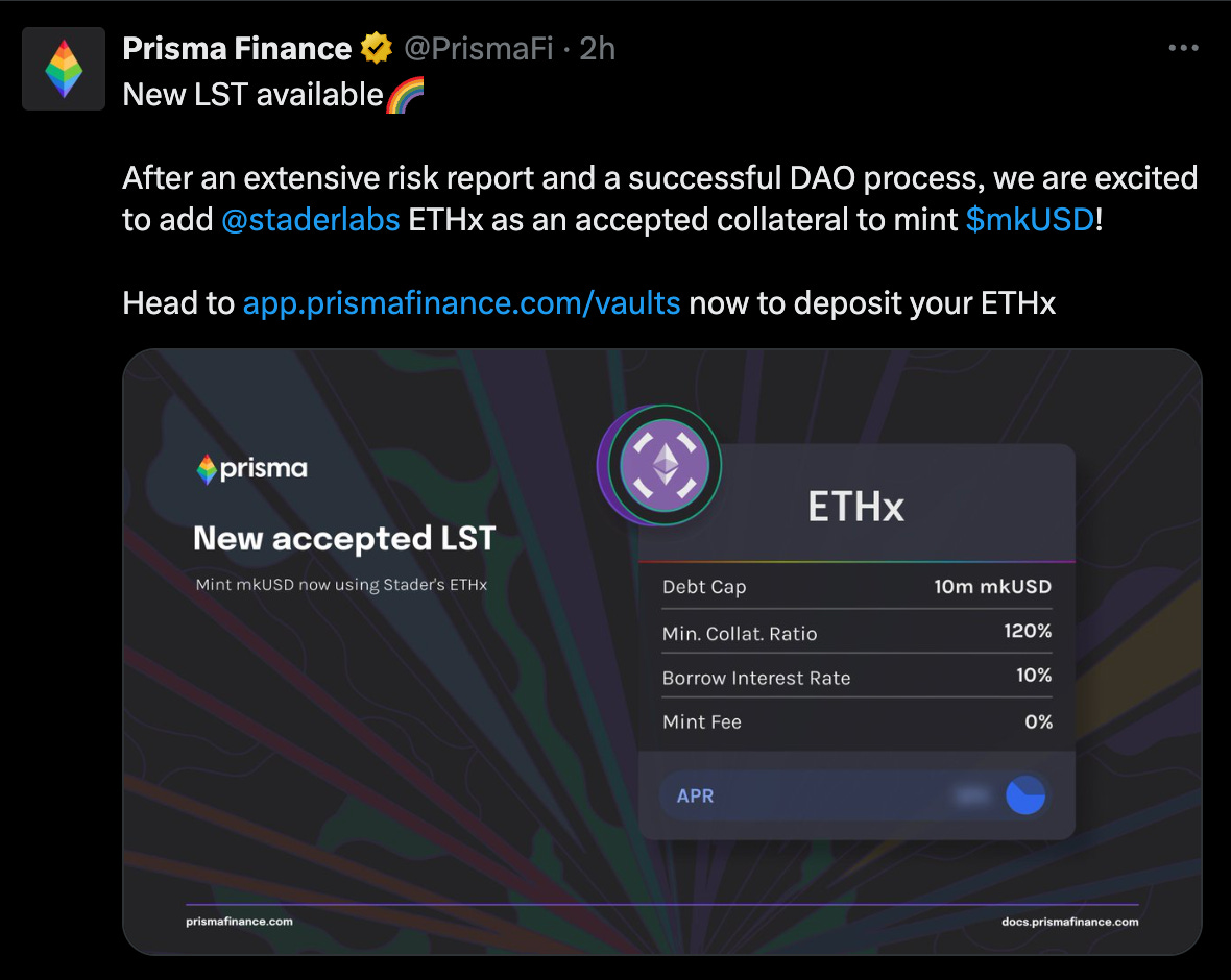 Most recently they added Stader Labs’ ETHx as collateral for minting $mkUSD.