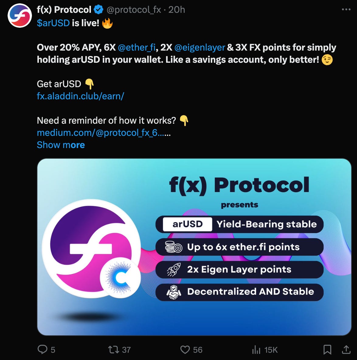 f(x) Protocol, another new member of Convex’s empire, has also been on its own spate of activity. The protocol has been applying its successful stablecoin/leverage formula to several assets, most recently launching $arUSD.