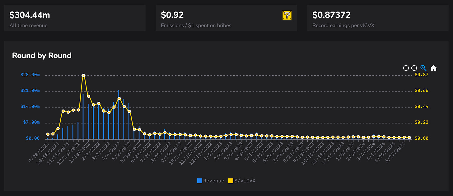 The actual operations of Convex were never as dire as one might have assumed from the moribund sentiment. Incentive markets may not have been as exuberant as when DeFi was in full swing, but they never disappeared. In total, Convex has returned nearly its entire market cap as revenue over its lifetime.