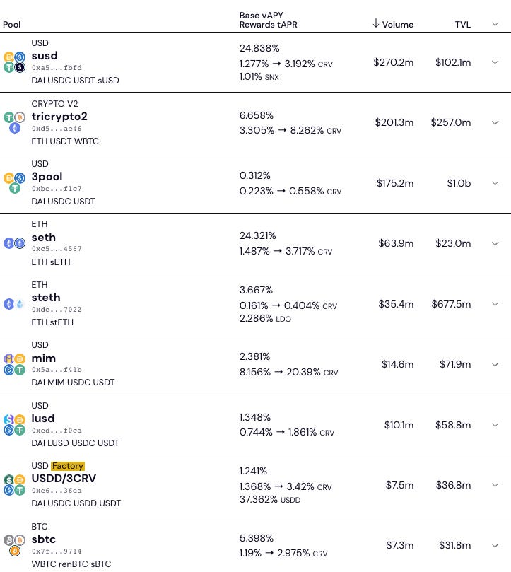 The list is well represented by Synthetix pools (sUSD, sETH, sBTC). In some cases, these pools are showing even higher trading volume than TVL.
