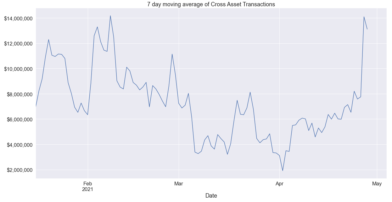 After a bit of a dip last month, transactions ticked up throughout April. Yesterday’s wild $50MM day pushed activity to record heights.