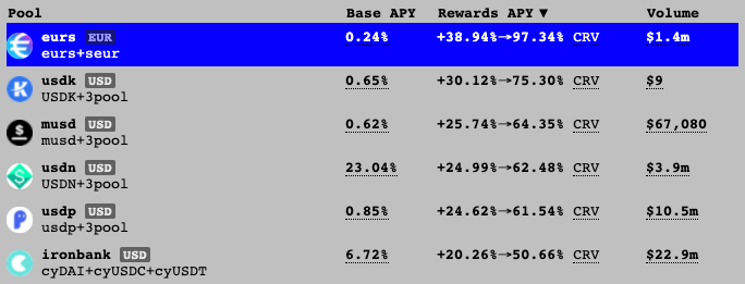 Another plausible explanation is simply that users want that juicy $CRV, the token that keeps on giving. The Euro pool is by far the best place to stake your money if you want to max out rewards.