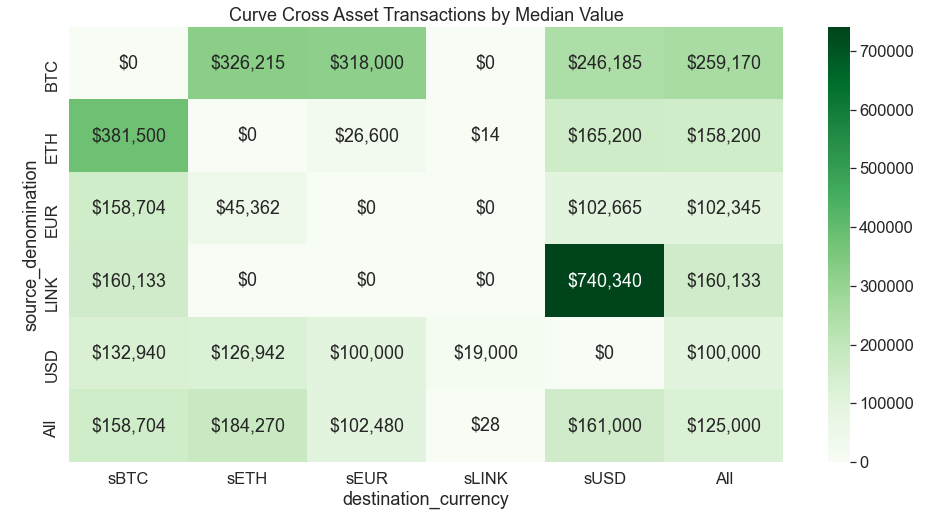 Although USD was the destination of choice for whales, the bulk of the activity among the peasant underclass was to sell off USD. $67MM in value left USD for BTC, Euros, and ETH (in order of total value). These tended to be relatively small transactions. The median sale was $100K, hardly enough to buy a roll of toilet paper these days.
