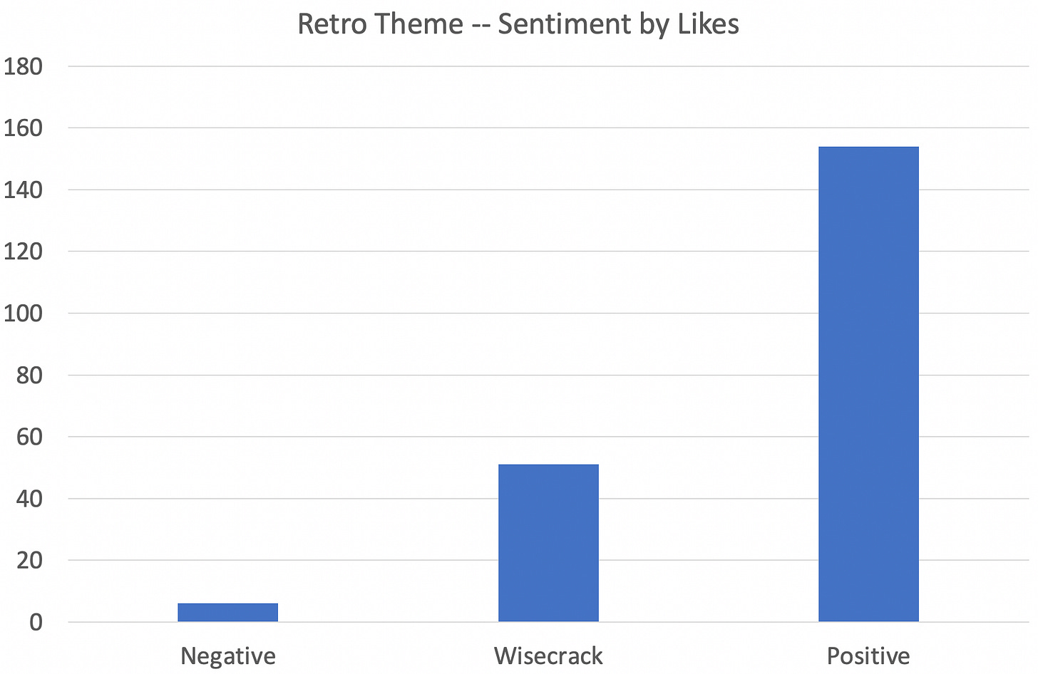 The plurality of responses expressed an unsolicited opinion on Curve’s retro theme, 39 posts (24% of respondents) . By a 3:1 margin, Curve users really like the retro theme — plus another bucket of people who cracked a joke related to this theme. These jokes were presumably positive, but the posts didn’t betray a sentiment one way or another.
