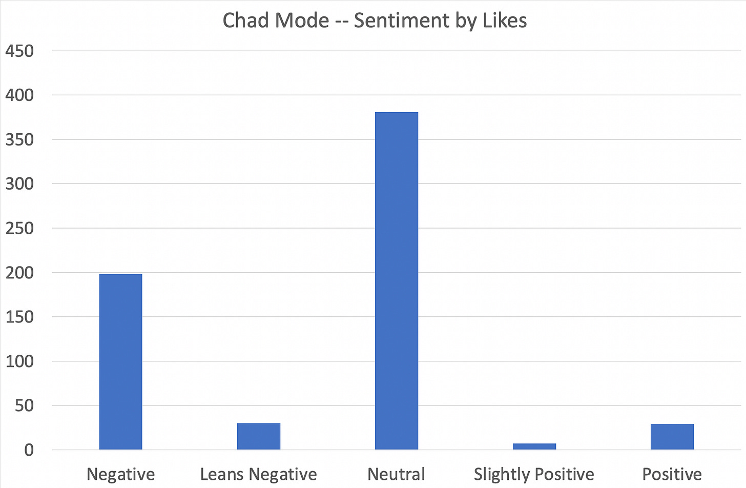 Replies mostly fell into a few basic topics. If you’d like to review the data yourself, check here. The sentiment scores were all manually reviewed and adjusted at human discretion, since services like IBM Watson might choke on a meme of Chad with an enlarged marsupium.