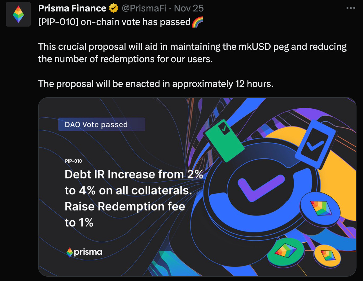 Prisma is similarly intervening to bolster the $mkUSD peg.
