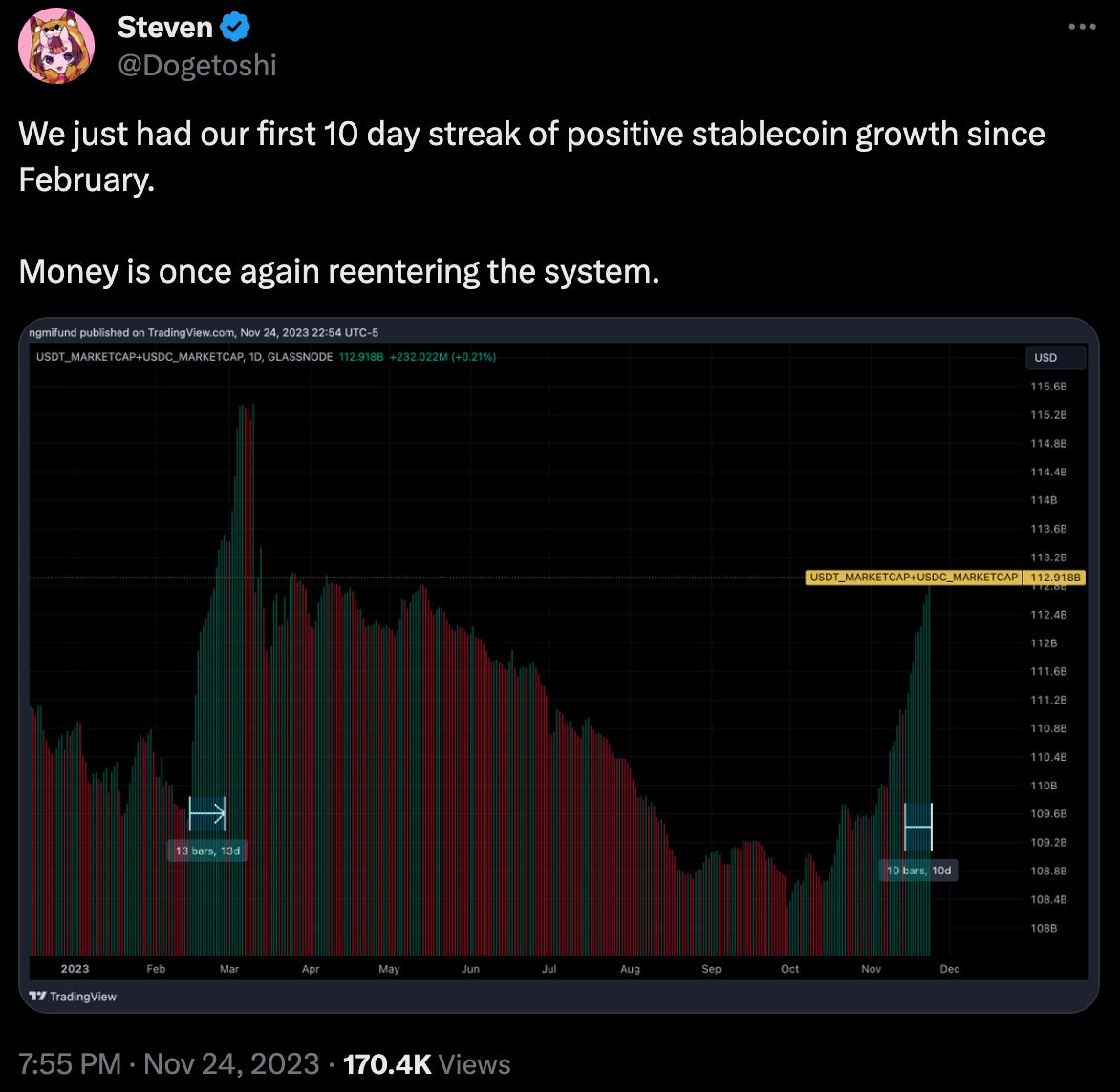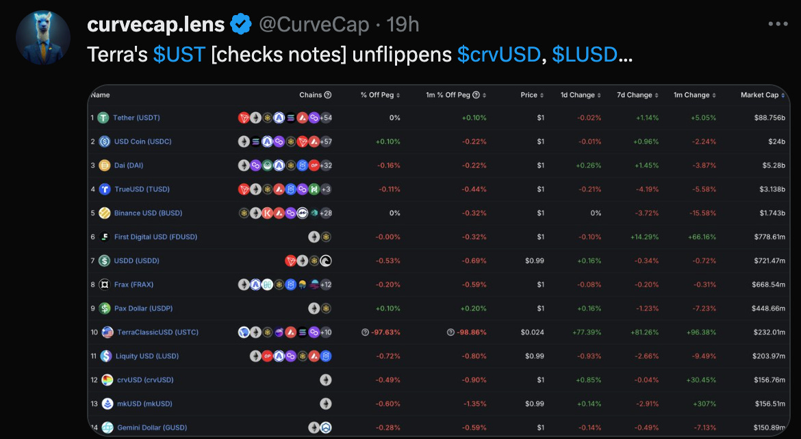 The rising tide may also be working to the benefit of $crvUSD. The better pegged stablecoin is seeing sustained all time supply highs, even with the DAO intervening to push up borrow rates.
