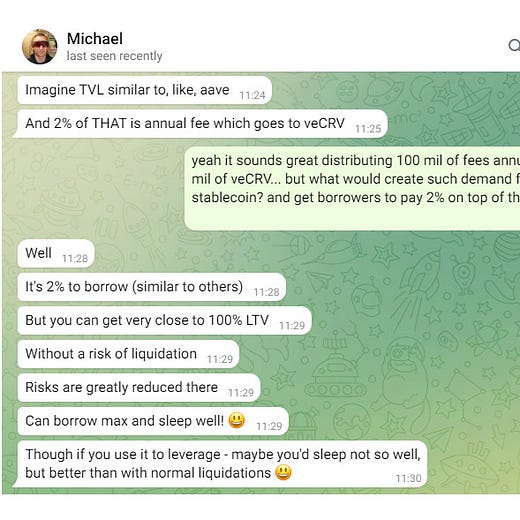 While the technical mechanics of how $crvUSD lending pools will accomplish this feat haven’t been released, we can imagine it borrows heavily from the lessons of v2 pools. For roughly a year, this code has been available to the public, ready for any coder to build such functionality into their own DeFi protocol. Since nobody else is grabbing the low hanging fruit, Mich is grabbing this and creating a novel twist on a stablecoin.