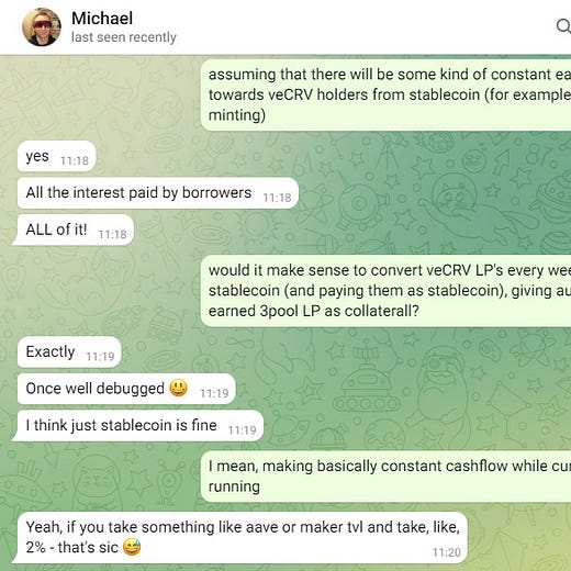 It’s worth noting that if Mich is considering getting to Maker and AAVE sized TVL, then he may well be eyeing Curve’s current TVL ($5.9B)